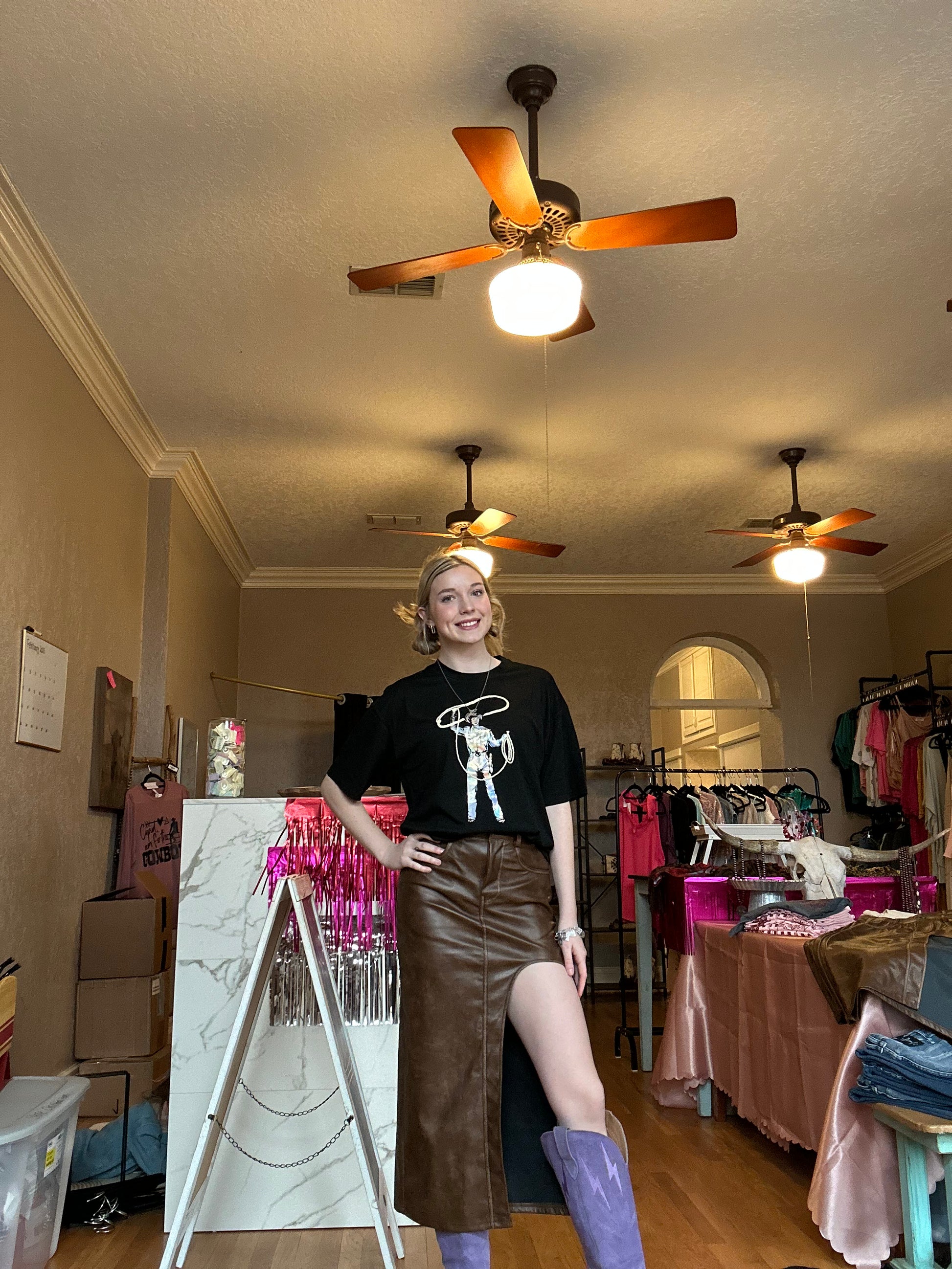 Black graphic t-shirt with a roper on the front with 3D rope on the front. 3/4 sleeve